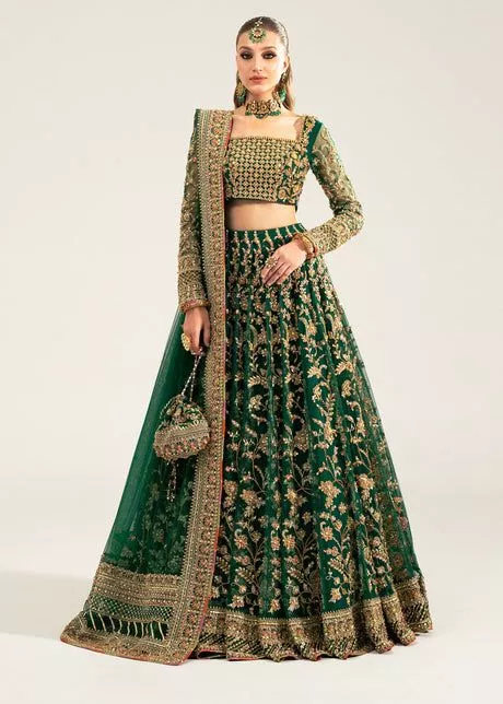 This exquisite bottle green lehenga choli set is designed to captivate with its elegance and intricate craftsmanship. Crafted from delicate net fabric, the ensemble features a beautifully adorned choli and a gracefully flowing lehenga. The lehenga showcases a floral jaal pattern, enriched with vibrant hues of orange and pink, while the entire outfit is meticulously embellished with gold, gotta, and silver work. The accompanying dupatta, also made from net, is enhanced with an embellished border, adding a touch of sophistication. Perfectly suited for an intimate event, this ensemble combines traditional charm with modern allure!